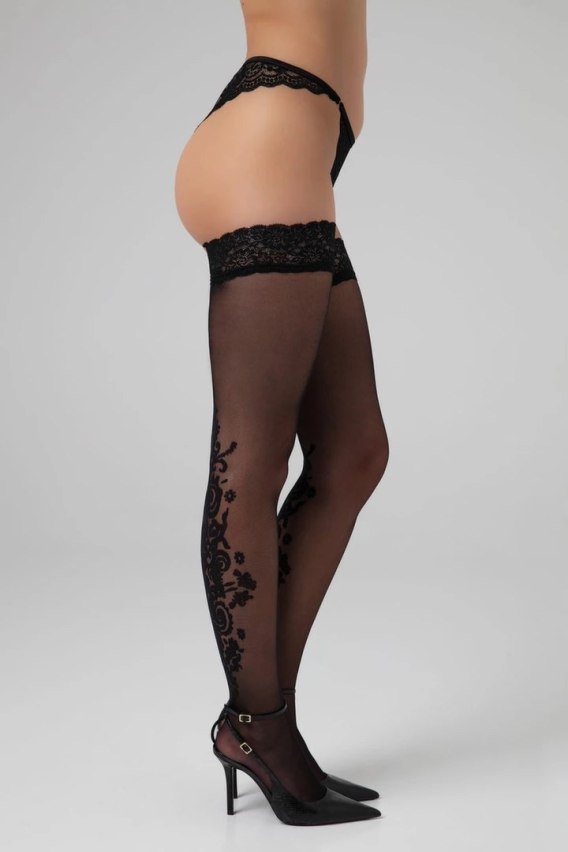 Christine Victorious - pończochy samonośne czarne z eleganckim kwiatowym motywem to wyjątkowy element garderoby, ktory łączy styl i komfort na najwyższym poziomie. Wykonane z delikatnej, transparentnej dzianiny o grubości 15 DEN, zachwycają subtelnym, przyciągającym uwagę wzorem florystycznym. Szerokie pasy z podwojnymi paskami silikonowymi gwarantują idealne utrzymanie pończoch na nodze bez konieczności użycia pasa.