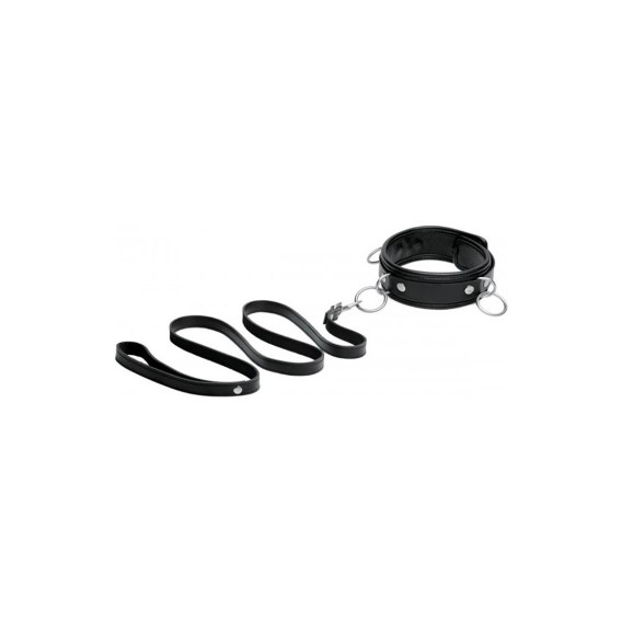 XR Brands Obroża skorzana z regulacją i smyczą, czarna