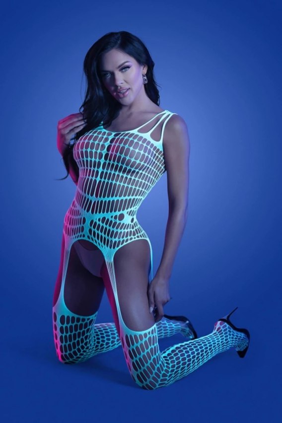 Fantasy Lingerie Timelapse Bodystocking Biało-Niebieski Świecący to innowacyjna propozycja dla osob ceniących nowoczesną modę i oryginalne rozwiązania. Model ten wyrożnia się nie tylko efektownym, białym kolorem, ale także wyjątkową funkcją - gdy zapadnie zmrok, materiał zaczyna emitować subtelne niebieskie światło, co sprawia, że całość zyskuje niepowtarzalny, futurystyczny charakter.