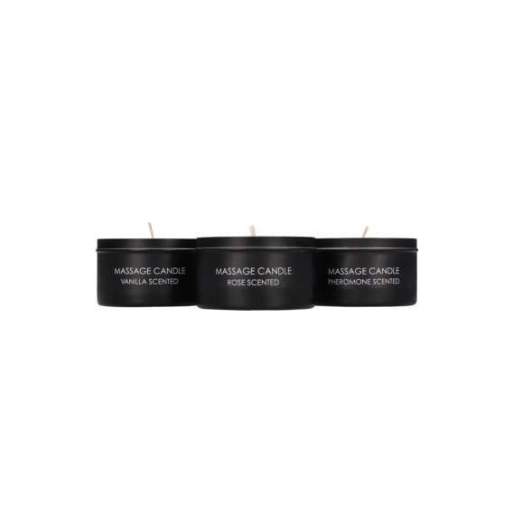 - Komplet trzech świec do masażu w eleganckich czarnych pojemnikach