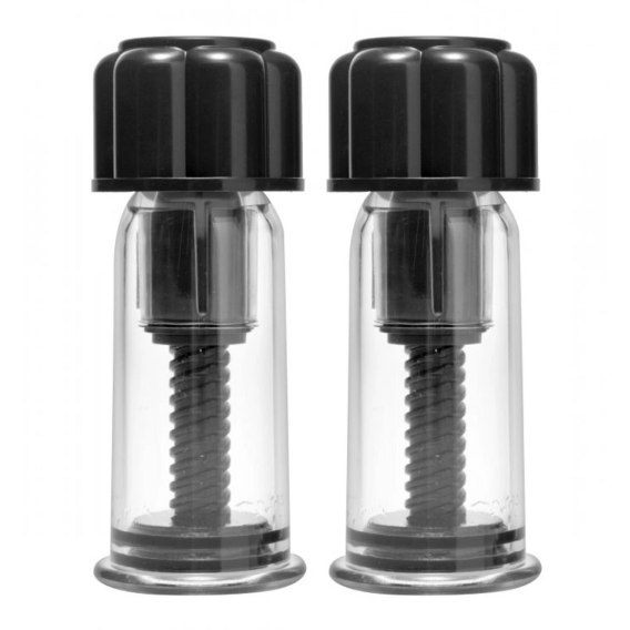 XR Brands Master Series - Skręcane przyssawki do ciała z mocnym systemem ssącym to wysokiej jakości akcesoria przeznaczone do precyzyjnego zastosowania na wybranych partiach ciała. Nowoczesny mechanizm pozwala na łatwe regulowanie poziomu ssania za pomocą wygodnego pokrętła, dzięki czemu użytkownik ma pełną kontrolę nad intensywnością działania. Solidna konstrukcja gwarantuje trwałość i niezawodność, a anatomiczny kształt przyssawek umożliwia dokładne przyleganie do skory.